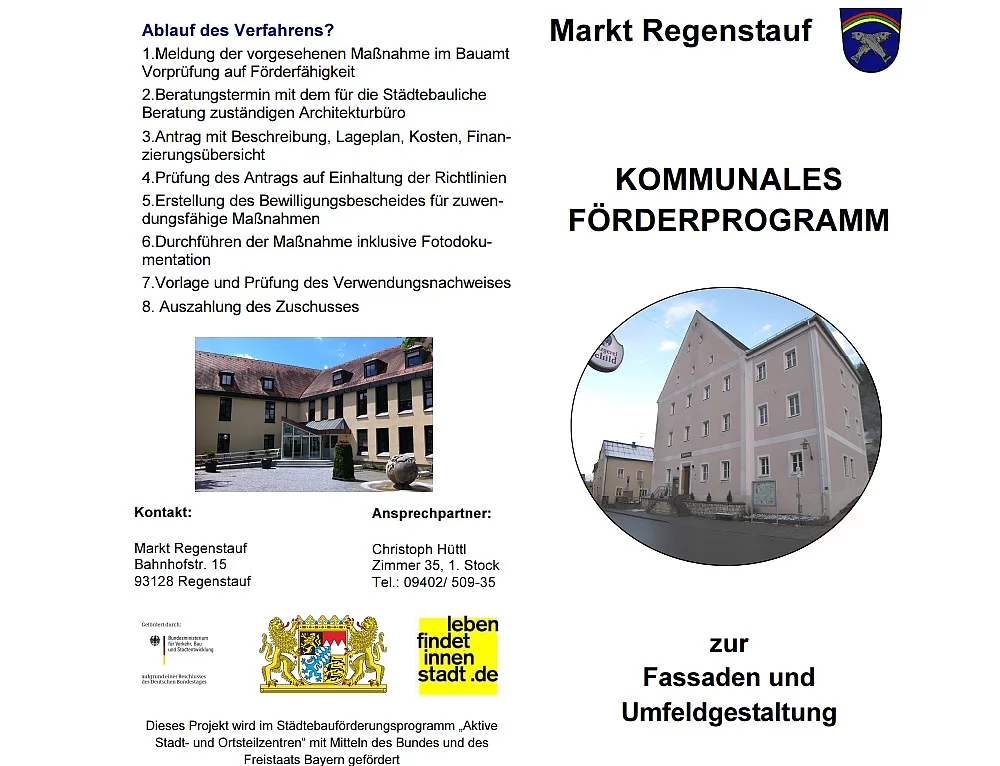 Der Marktgemeinderat hat in der Sitzung am 12.11.2013 die „Richtlinie zur kommunalen Förderung kleiner privater Baumaßnahmen der Fassaden- und Umfeldgestaltung im Rahmen der städtebaulichen Erneuerung der Ortsmitte im Markt Regenstauf” (Kommunales Förderprogramm zur Fassadengestaltung) beschlossen.