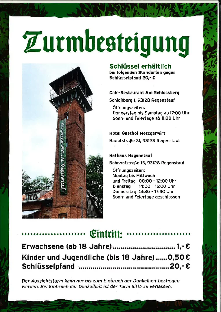 Der Aussichtsturm kann nur bis zum Einbruch der Dunkelheit bestiegen werden. Bei Einbruch der Dunkelheit ist der Turm bitte zu verlassen.